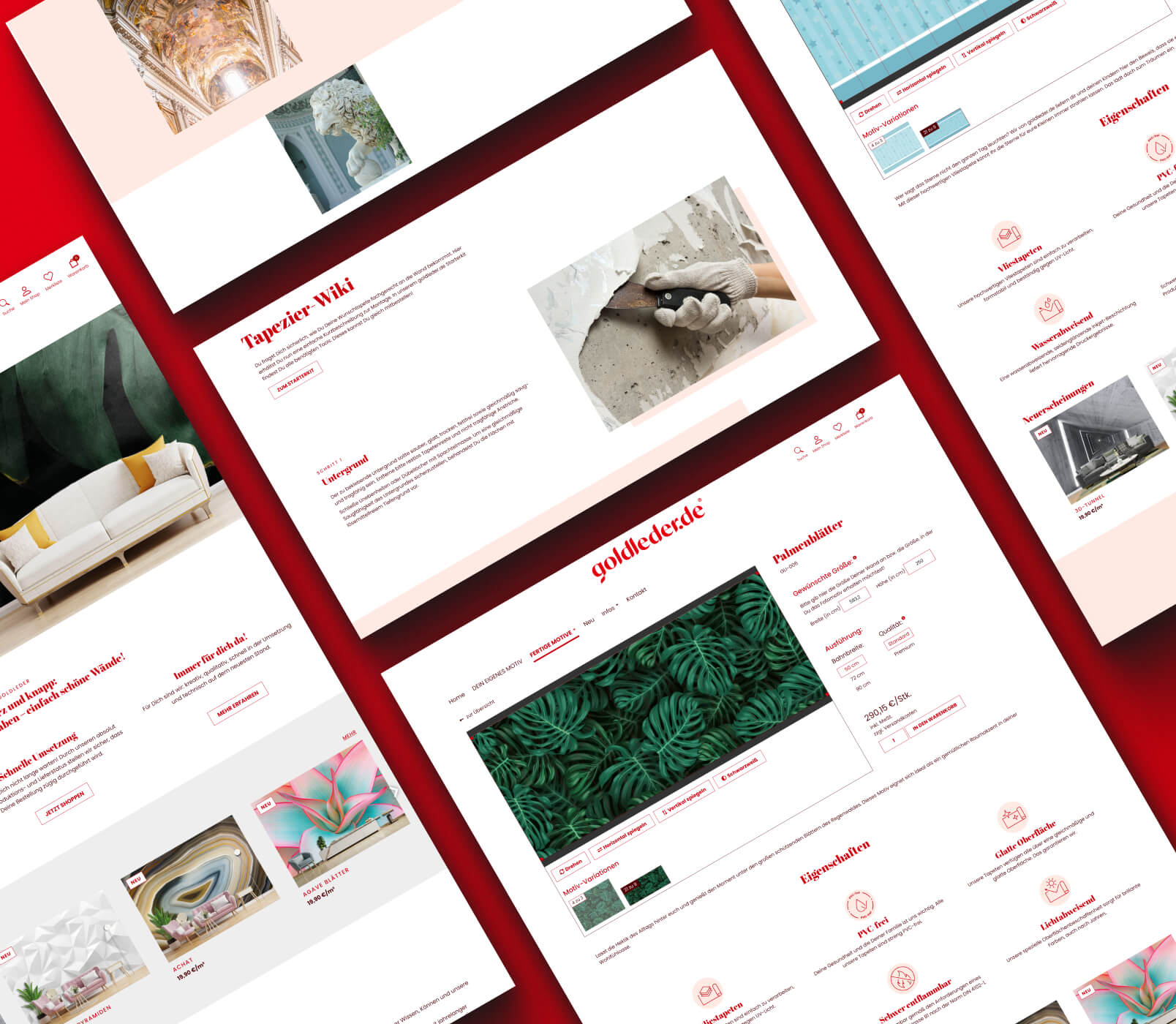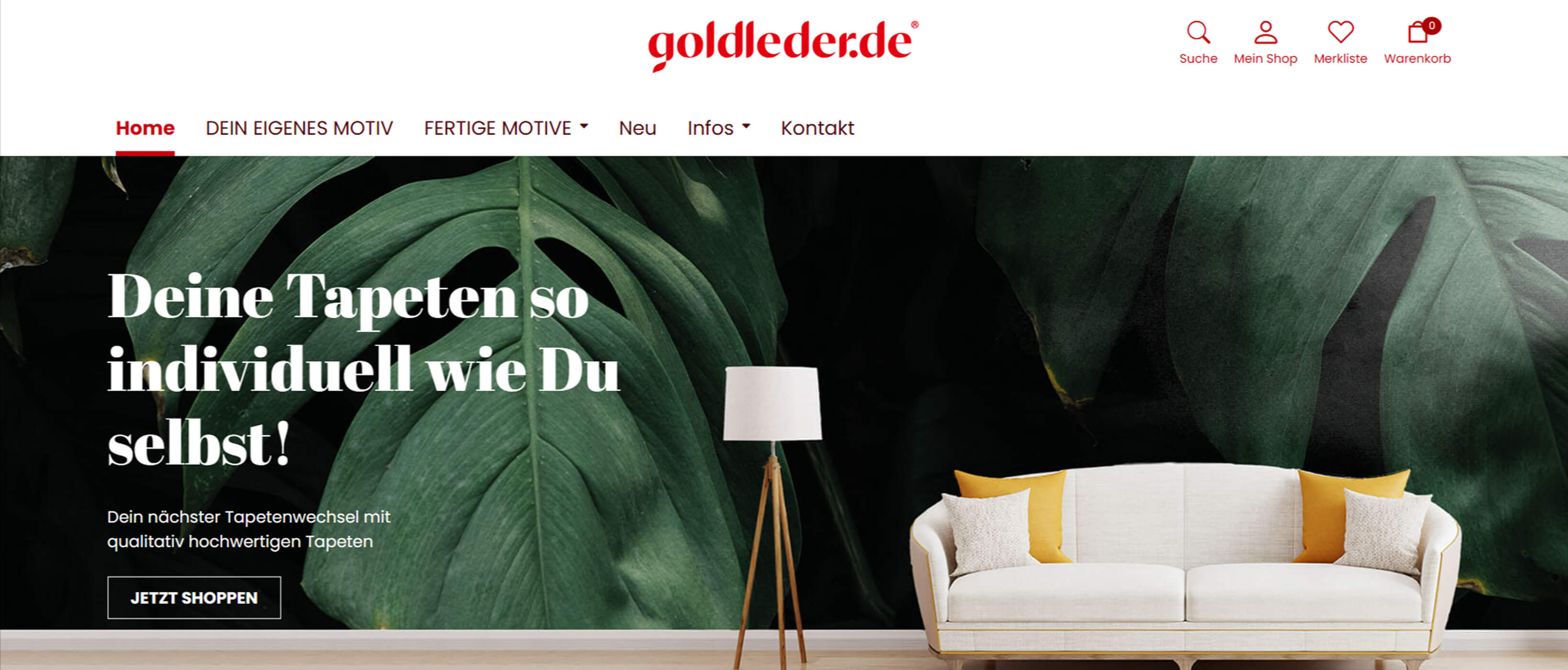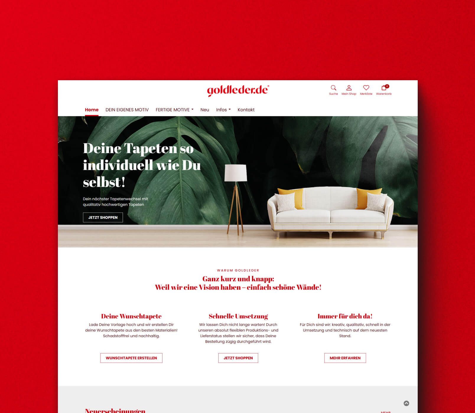 Für Goldleder, den Hamburger Tapetenhersteller, haben wir einen Onlineauftritt geschaffen, der die kreative Vielfalt und hochwertige Verarbeitung der Tapeten in den Mittelpunkt stellt. Unser Kunde ist eigentlich ein führender Anbieter für Werbetechnik aus Hamburg und etablierte mit Goldleder eine neue Marke im Bereich Tapeten. Individuelle Motive können hier nach Wunschmaß als perfekt passende Tapete konfiguriert werden. Der Onlineshop präsentiert die Kollektionen übersichtlich, zeigt Designbeispiele inspirierend und transportiert die Eleganz und Individualität, für die Goldleder steht, so wird das Online-Erlebnis zum digitalen Spiegel der Markenidentität.