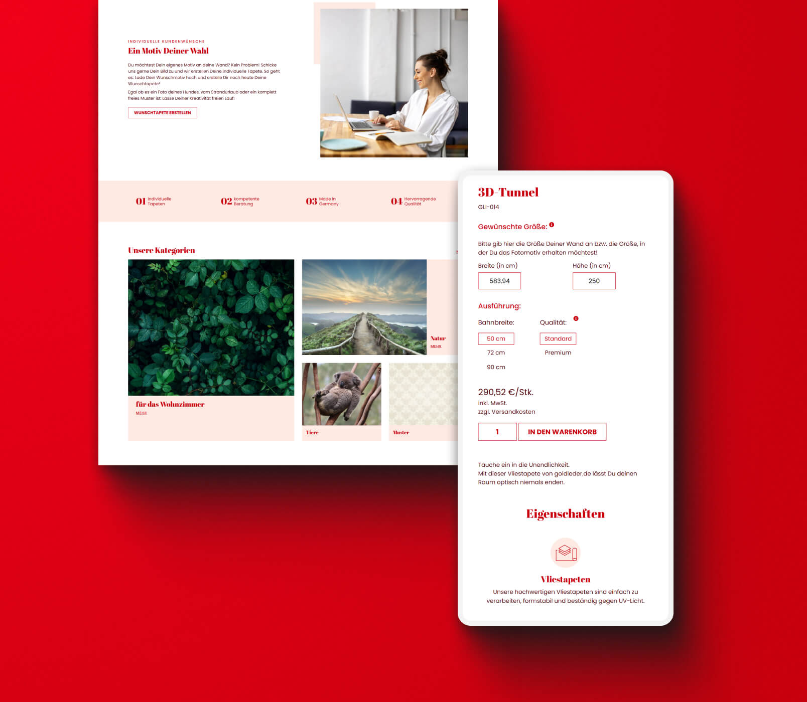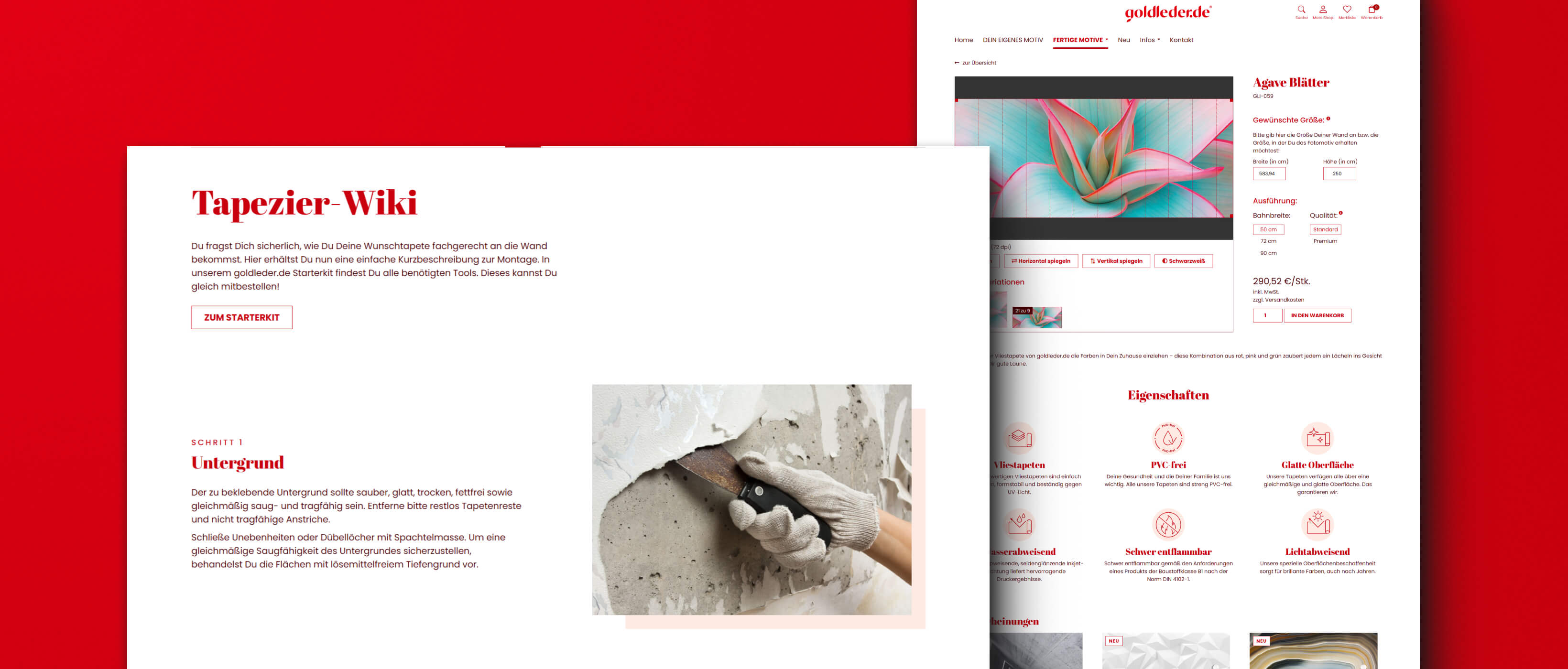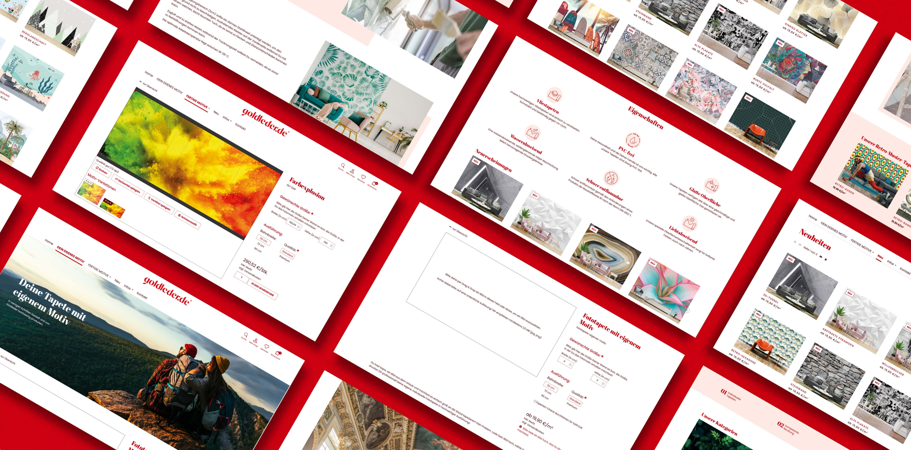 Für Goldleder, den Hamburger Tapetenhersteller, haben wir einen Onlineauftritt geschaffen, der die kreative Vielfalt und hochwertige Verarbeitung der Tapeten in den Mittelpunkt stellt. Unser Kunde ist eigentlich ein führender Anbieter für Werbetechnik aus Hamburg und etablierte mit Goldleder eine neue Marke im Bereich Tapeten. Individuelle Motive können hier nach Wunschmaß als perfekt passende Tapete konfiguriert werden. Der Onlineshop präsentiert die Kollektionen übersichtlich, zeigt Designbeispiele inspirierend und transportiert die Eleganz und Individualität, für die Goldleder steht, so wird das Online-Erlebnis zum digitalen Spiegel der Markenidentität.