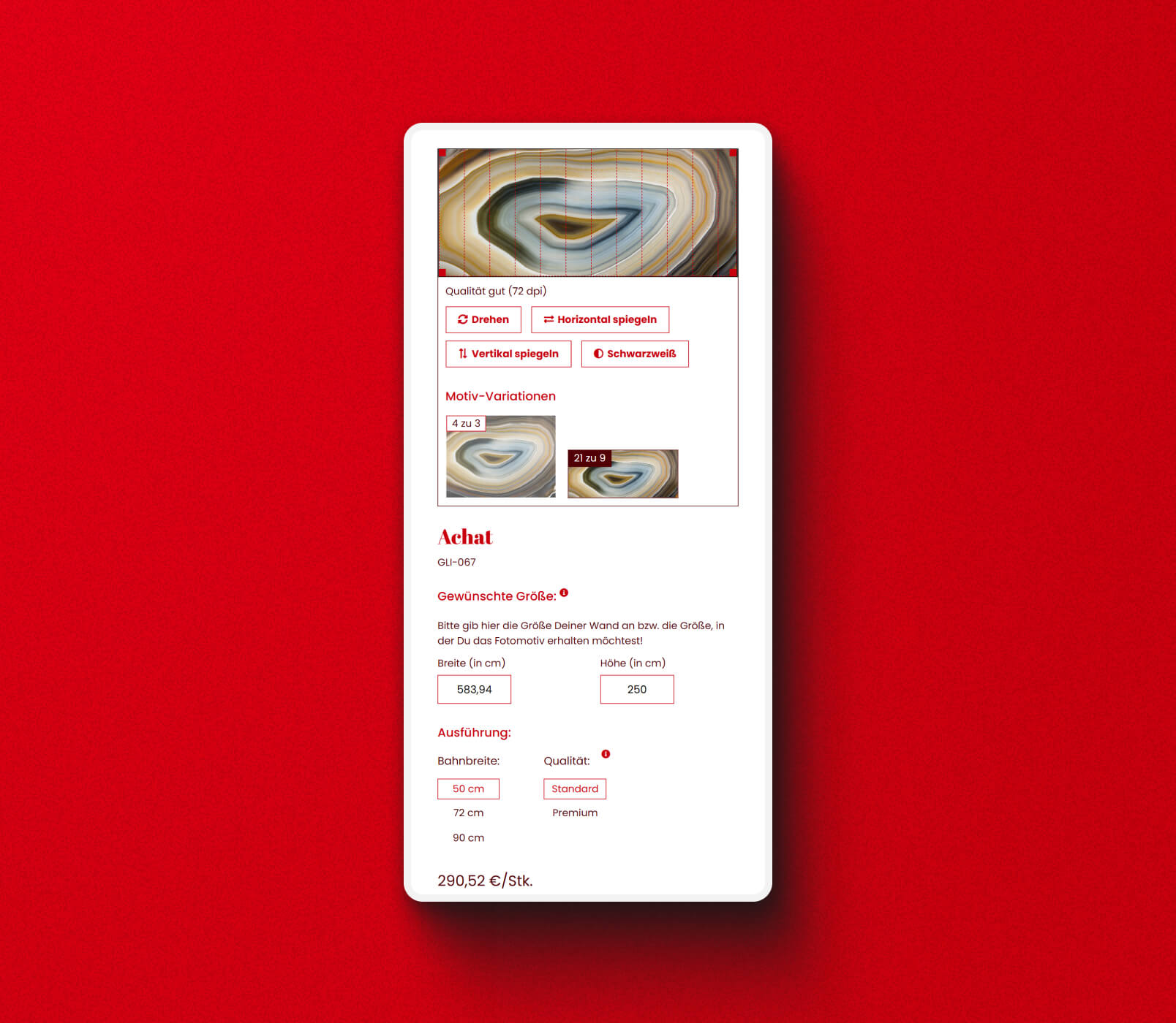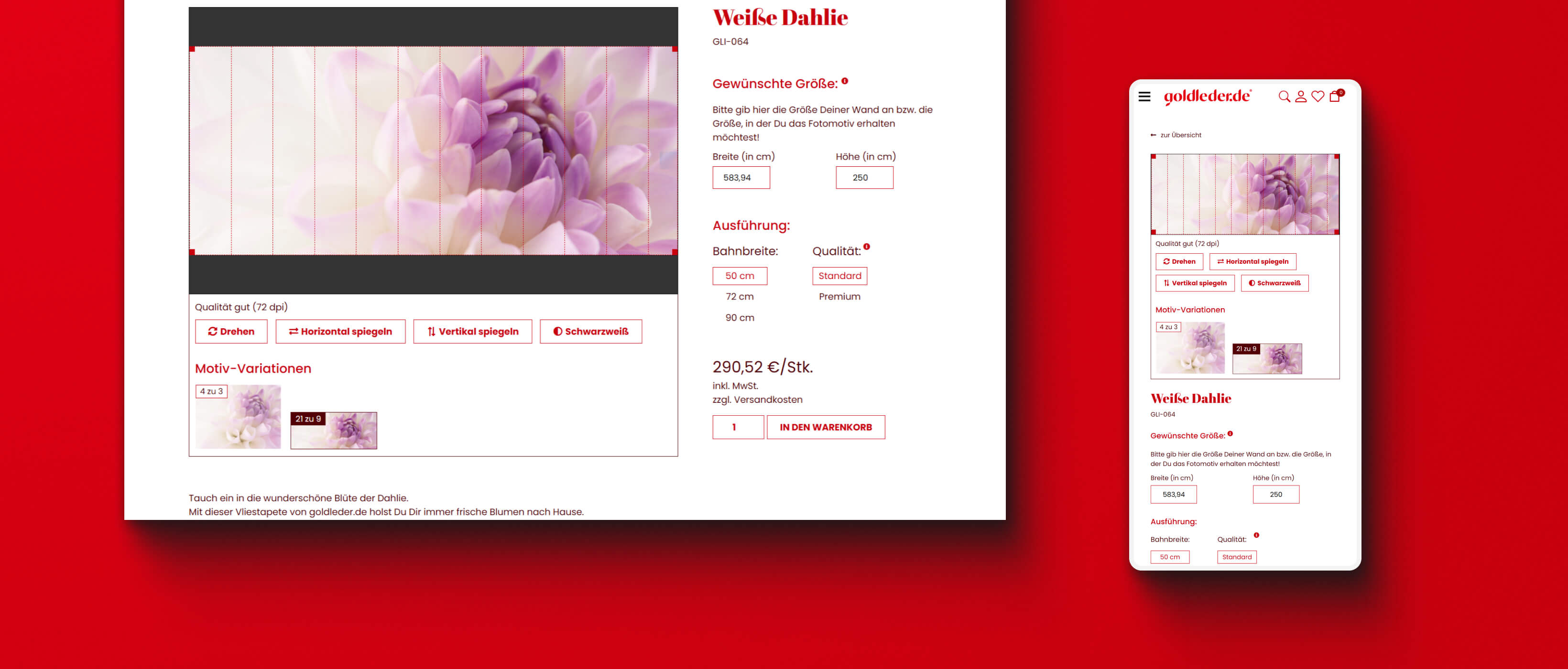 Ein Herzstück des Goldleder-Auftritts ist der Konfigurator, der Kunden ein interaktives und kreatives Einkaufserlebnis bietet. Nutzer können eigene Bilder hochladen, diese direkt mit verschiedenen Effekten bearbeiten und erhalten eine automatische Prüfung der Bildqualität, um sicherzustellen, dass das Ergebnis perfekt umgesetzt wird. So wird der kreative Gestaltungsprozess online erlebbar, und jeder Kunde kann seine Tapetenideen individuell visualisieren. Intuitiv, flexibel und höchst benutzerfreundlich.