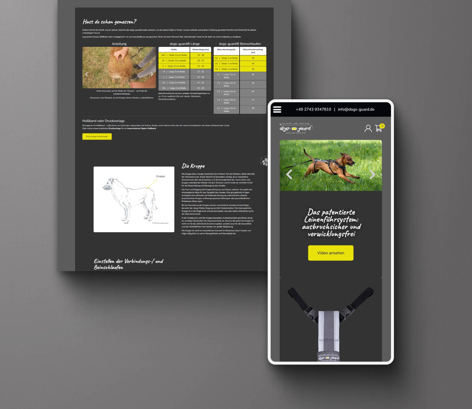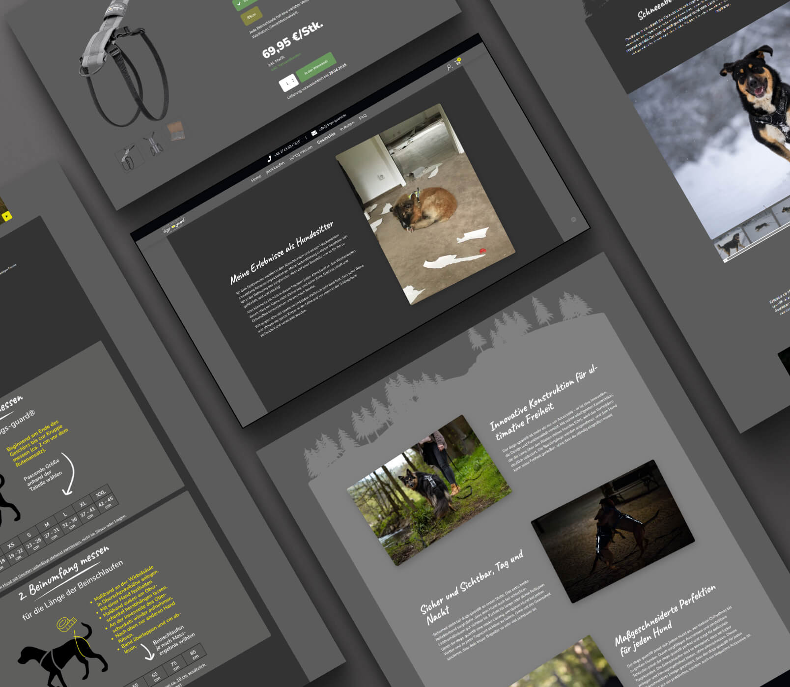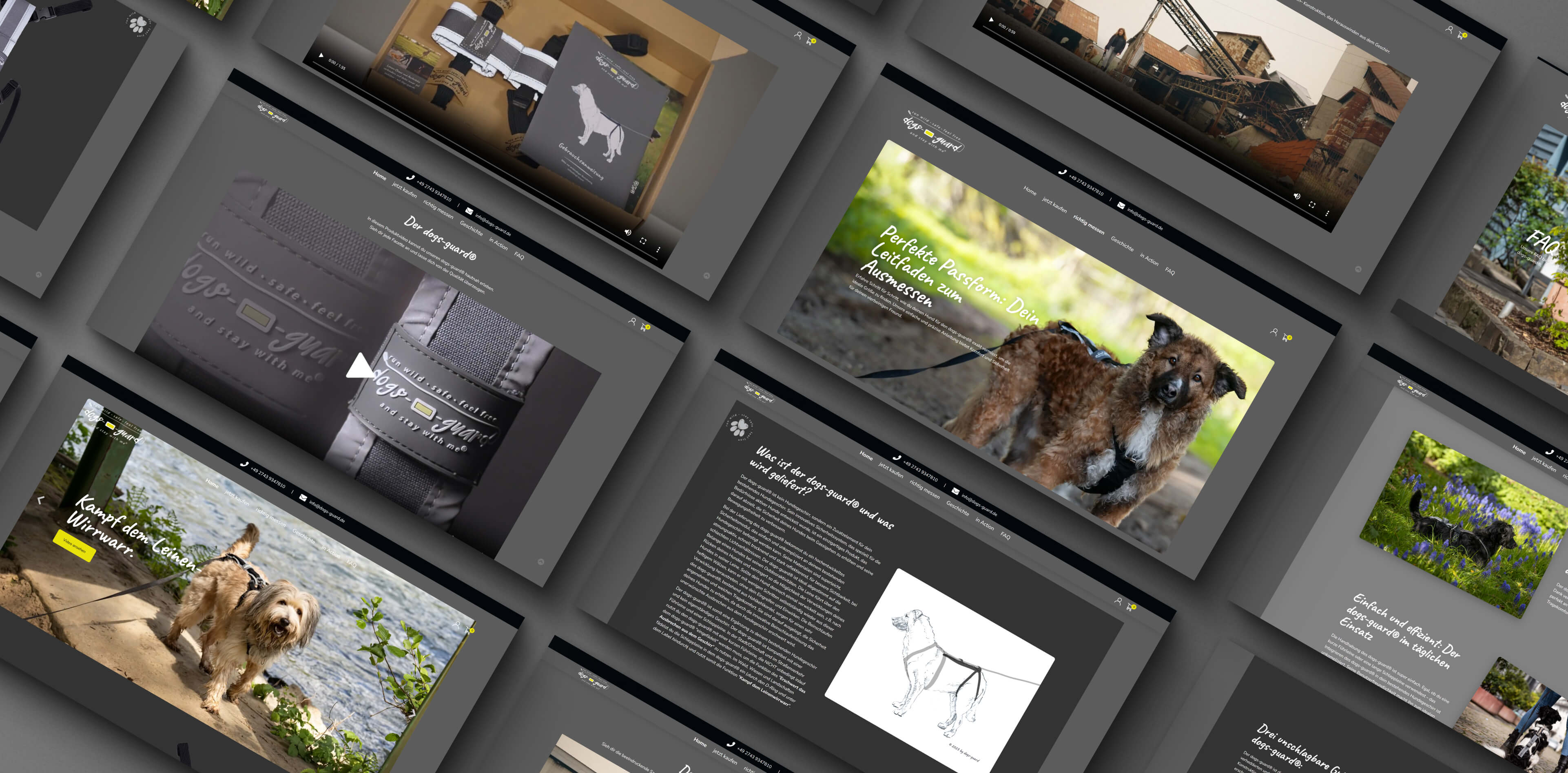 Da das Produkt von Dogs Guard eine individuelle und persönliche Entwicklungsgeschichte hat, erfolgte die Umsetzung des Projekts in enger Absprache nach Kundenwunsch. Wir legten besonderen Wert darauf den Entwicklungsweg von Dogs Guard wiederzugeben und die praktischen Vorzüge des Dogs Guard-Hungeschirrs darzustellen.