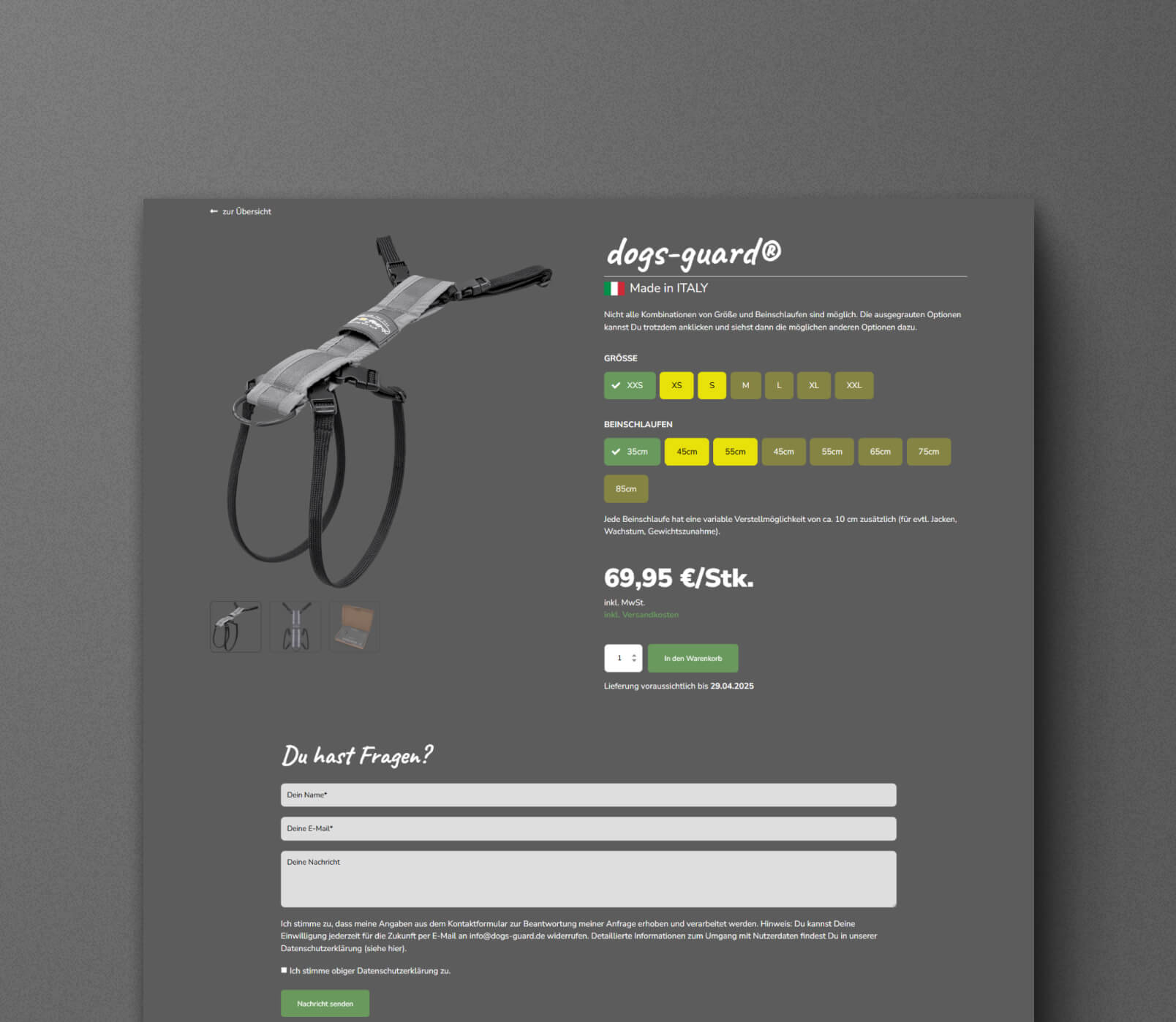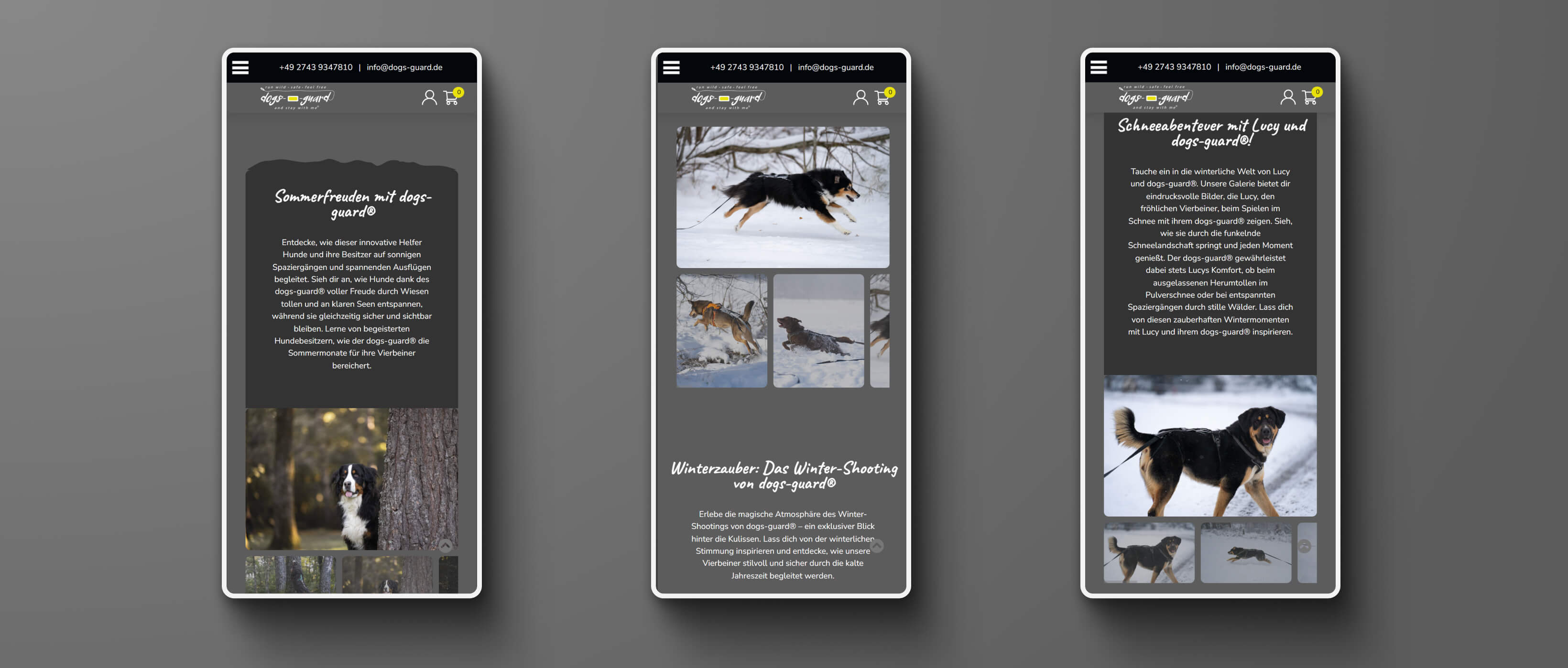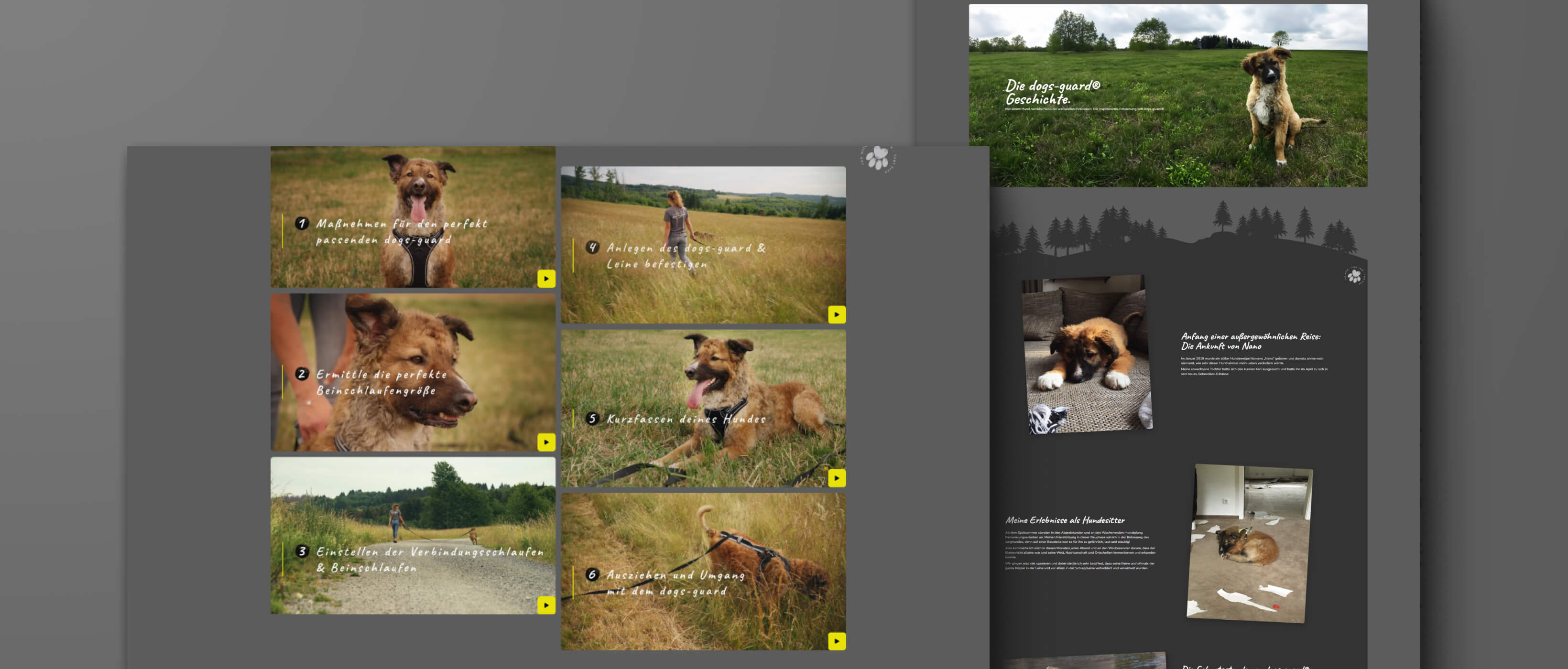 Da das Produkt von Dogs Guard eine individuelle und persönliche Entwicklungsgeschichte hat, erfolgte die Umsetzung des Projekts in enger Absprache nach Kundenwunsch. Wir legten besonderen Wert darauf den Entwicklungsweg von Dogs Guard wiederzugeben und die praktischen Vorzüge des Dogs Guard-Hungeschirrs darzustellen.