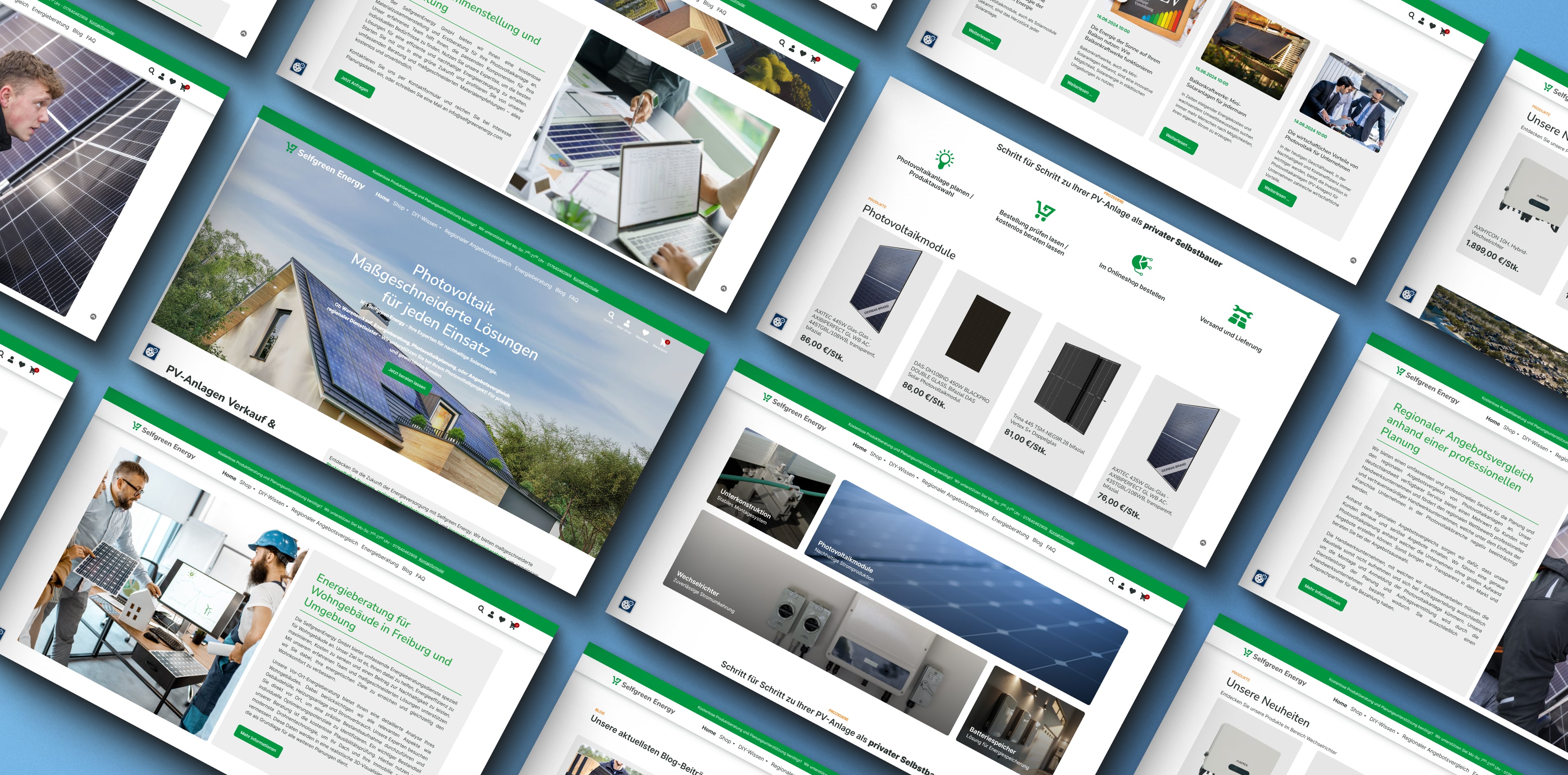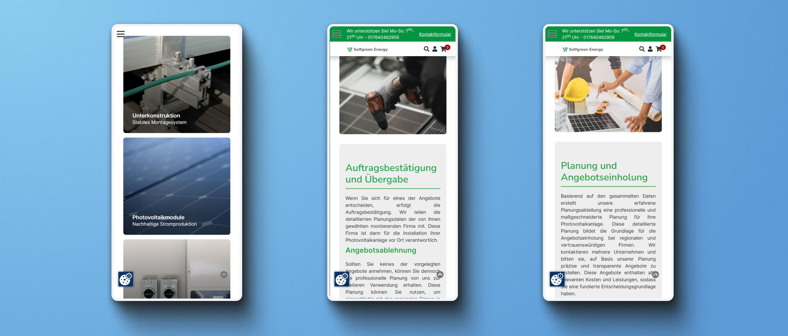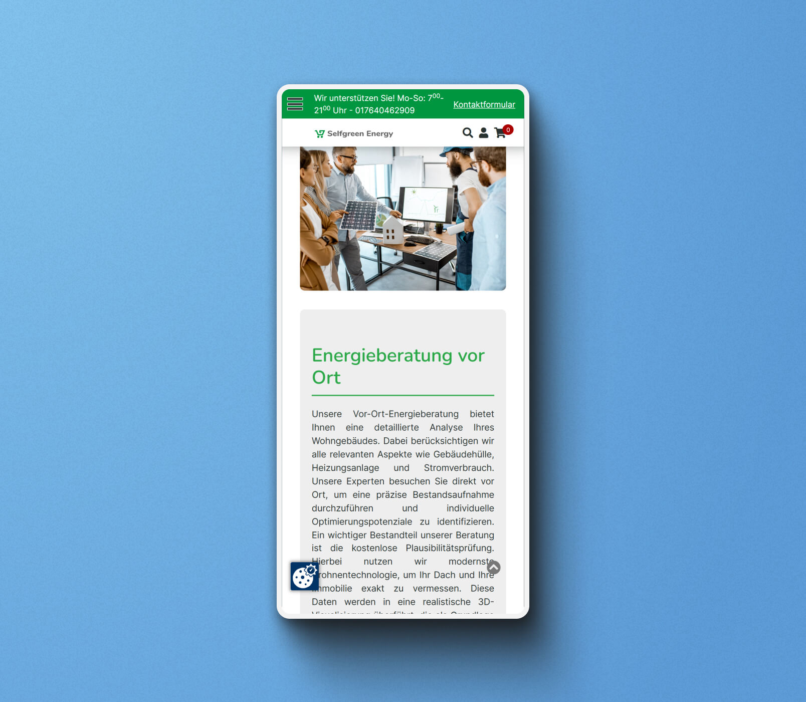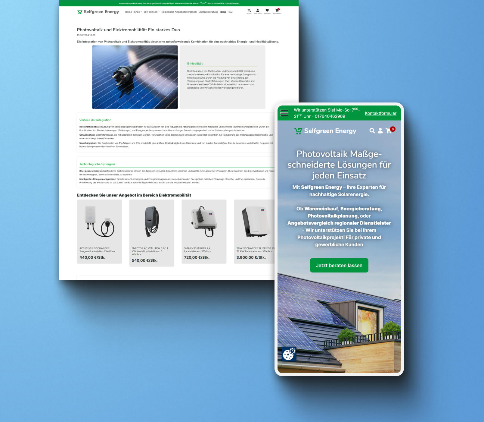 Suchmaschinenoptimierung ist selbstverständlich Teil unseres Service. So haben wir bei der Seite von Selfgreen Energy unter anderem SEO-relevante Key-Phrases in Metadaten und Textelemente eingepflegt. Darüber hinaus erfüllen unsere Shops durch Mobilgeräteoptimierung und schnelle Perfomance über weitere wichtige Faktoren für das Ranking von Suchmaschinen.