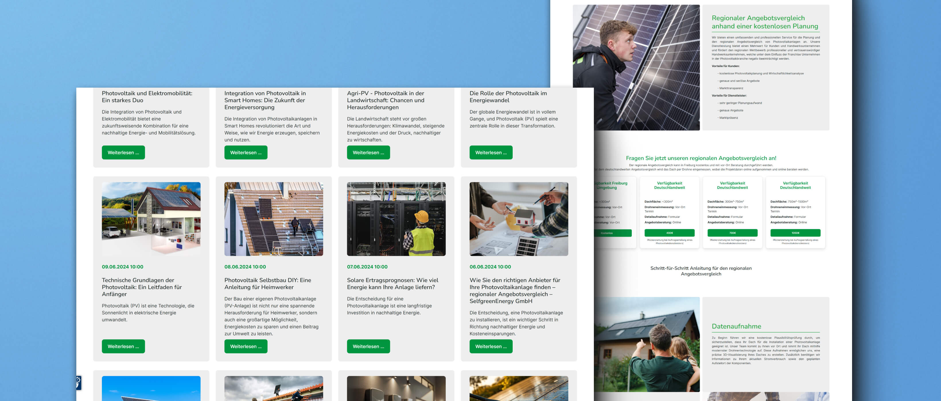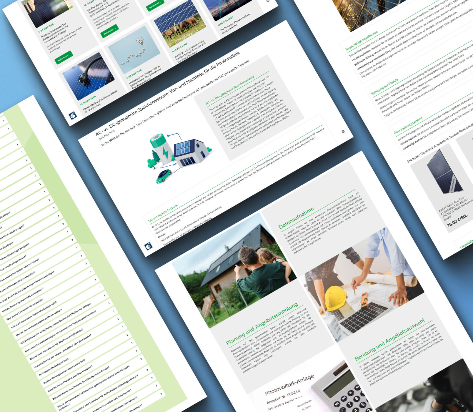 Für den Anbieter von Photovoltaik-Lösungen und Energieberatung wurde ein Seitenlayout benötigt, welches die technisch innovativen Aspekte mit Nachhaltigkeit vereint. Darüber hinaus sollten alle wichtigen Infos rund ums Thema PV-Anlage und Energieversorgung umfänglich behandelt und verständlich dargestellt werden.