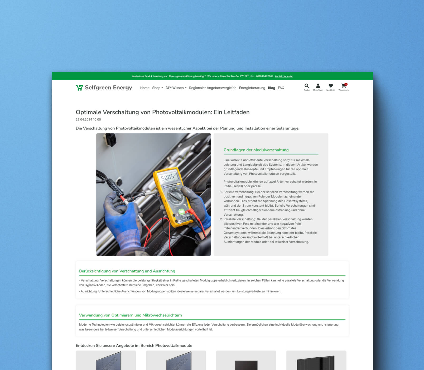 Neben Einkaufsmöglichkeiten von Photovoltaikmodulen und entsprechendem Zubehör bietet Selfgreen Energy auch weitere Services an. Über die Seite können Infomaterialien zu verschiedenen Produkten bezogen werden. Daneben ermöglicht Selfgreen Energy einen Angebotsvergleich als auch umfassende Energieberatung und Unterstützung bei der Planung eigner PV-Anlagen.
