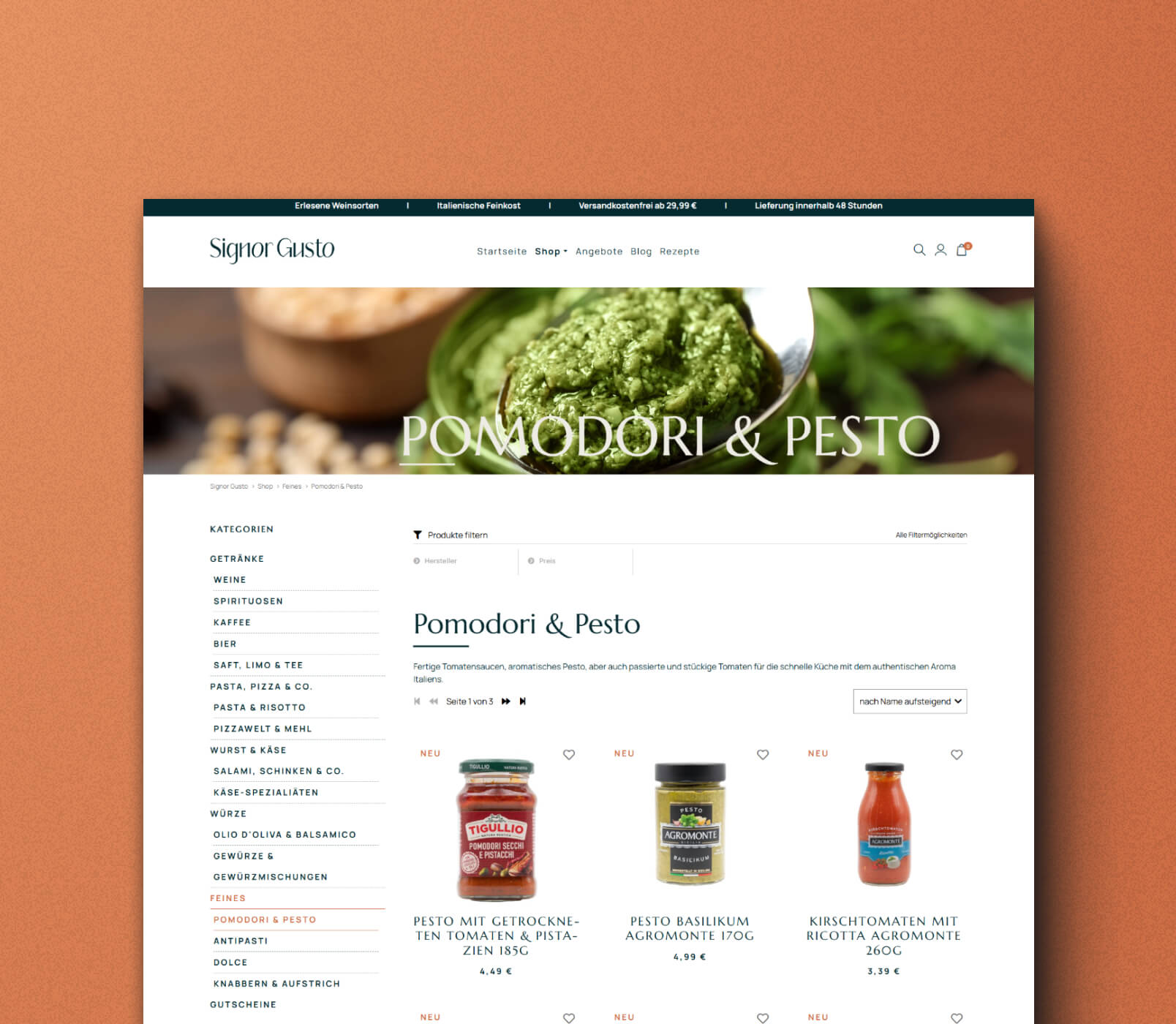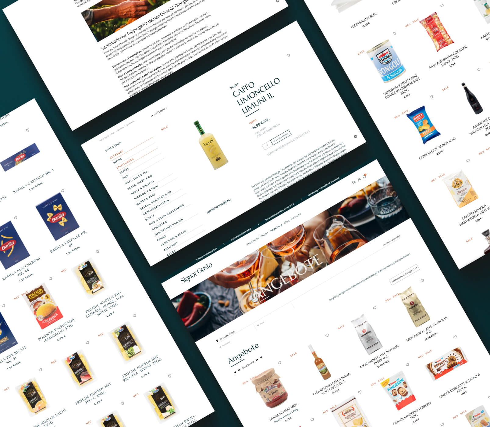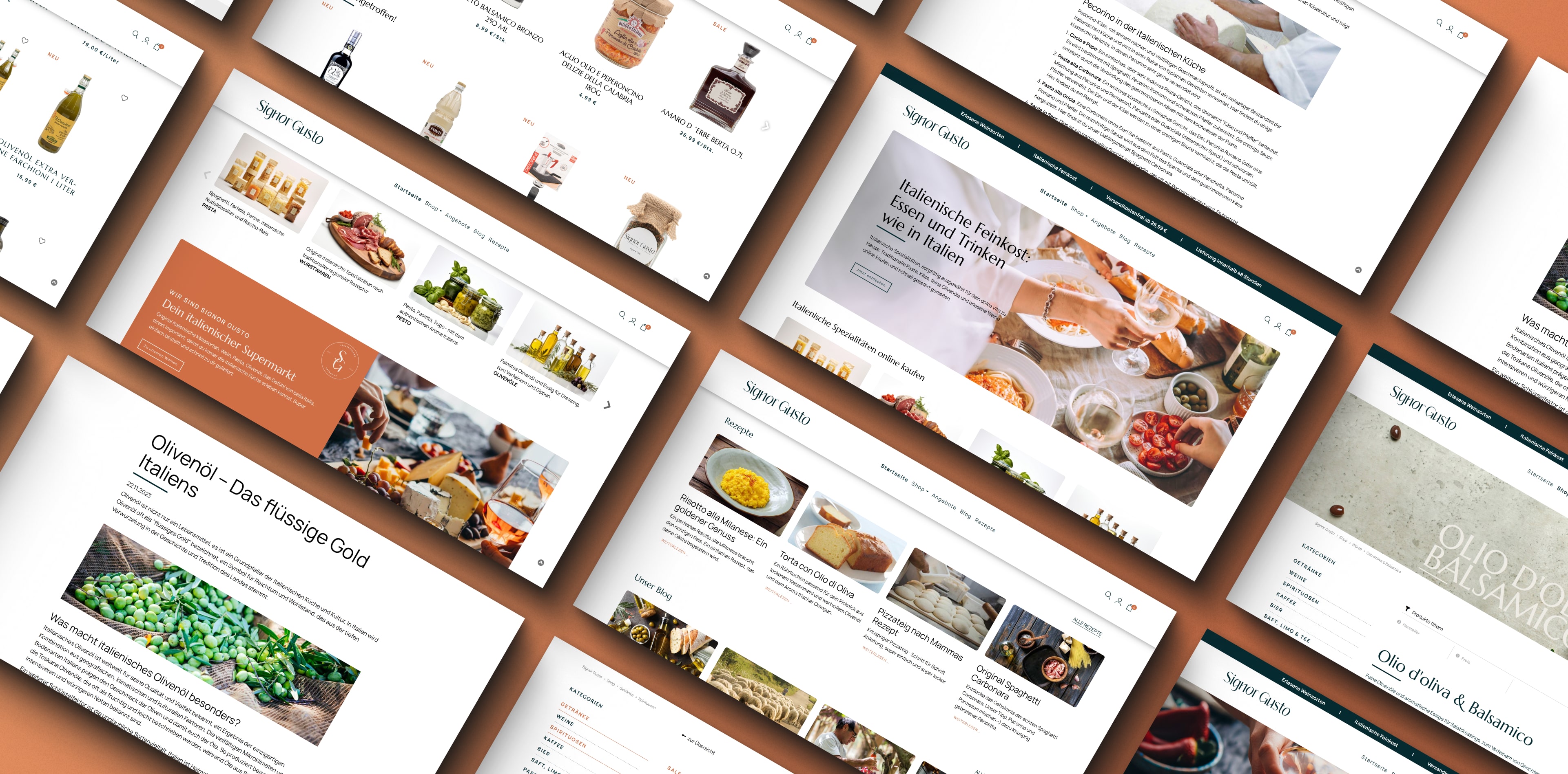 Als Feinkost-Händler bildet das erlesene Warensortiment das Herzstück von Signor Gusto. Da sich die feinen Aromen der großen Auswahl italienischer Spezialitäten aber nicht durch einen Bildschirm übertragen lassen, lösten wir diese Herausforderung durch die Inszenierung sorgfältig ausgewählter Fotos der angebotenen Speisen, die schon beim bloßen Anblick Lust auf mehr machen