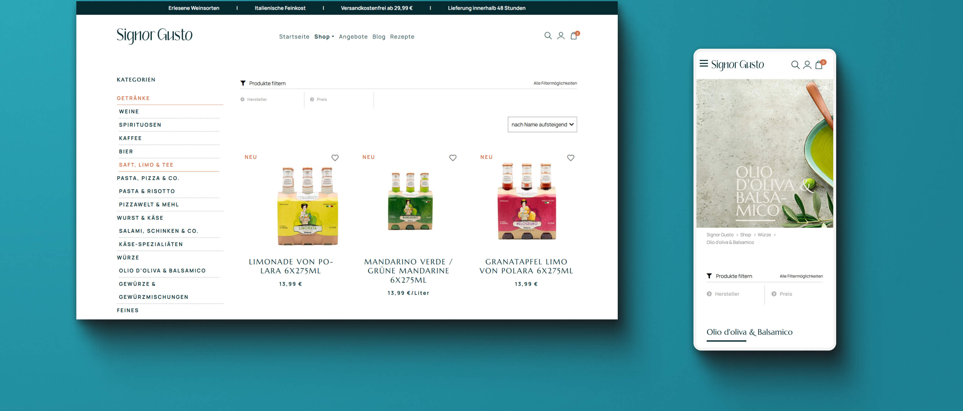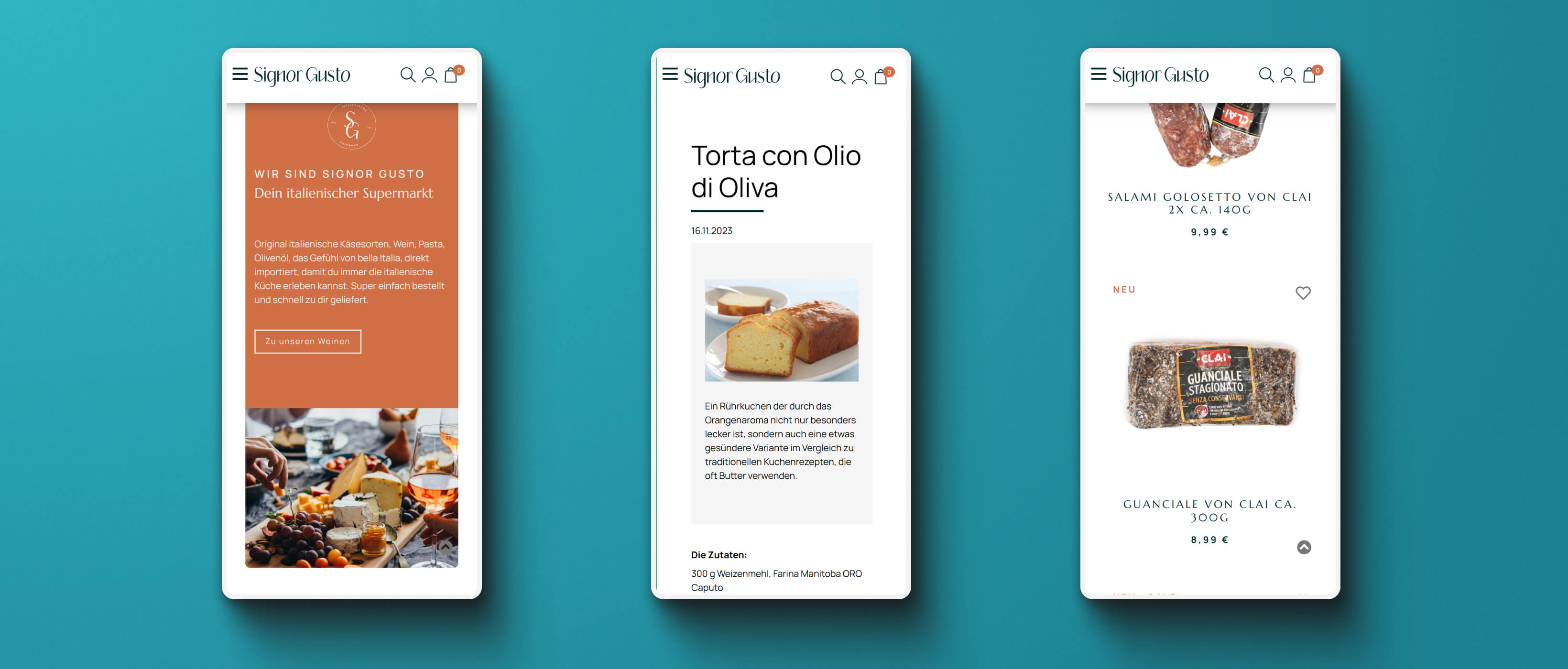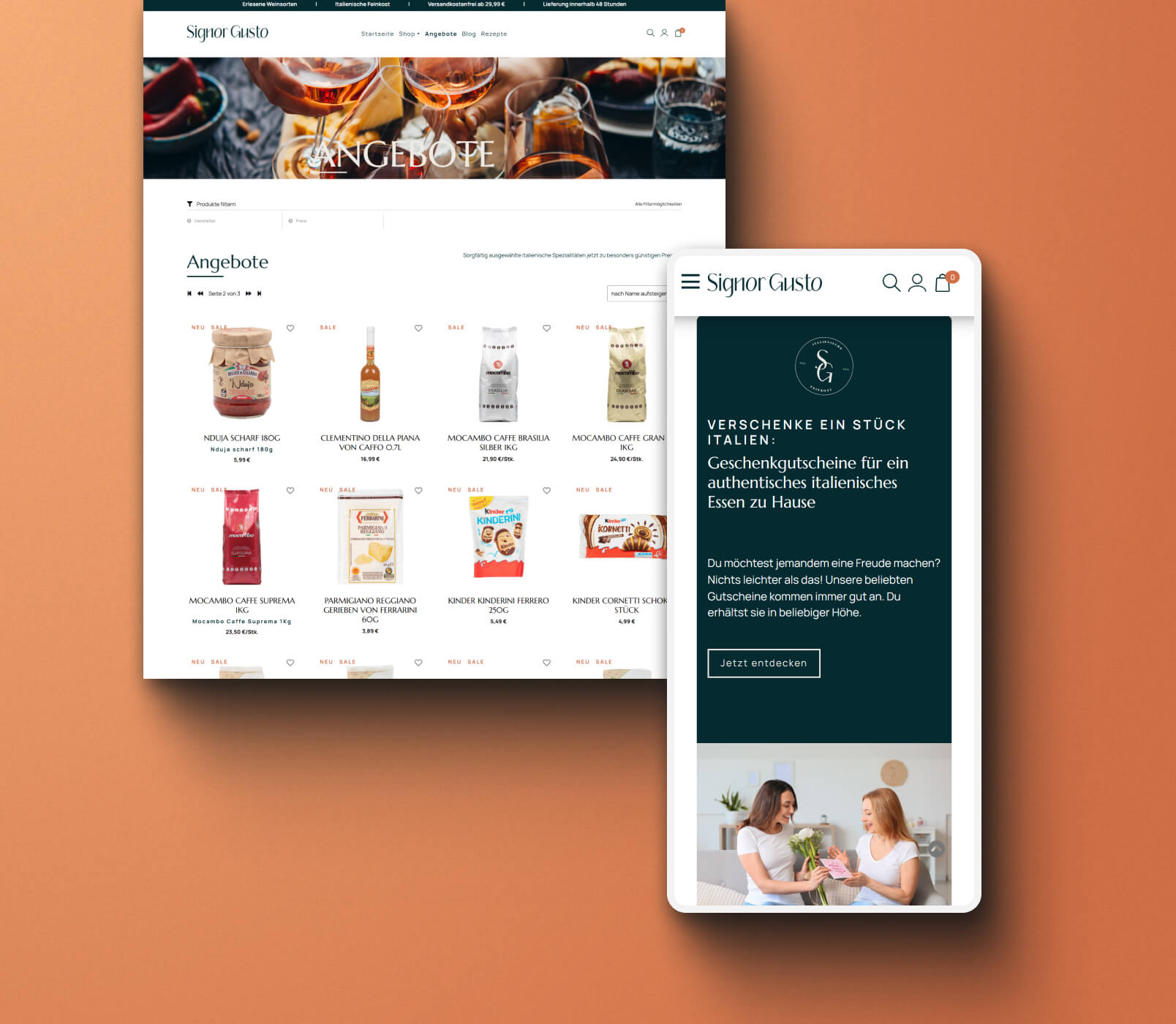 Als Feinkost-Händler bildet das erlesene Warensortiment das Herzstück von Signor Gusto. Da sich die feinen Aromen der großen Auswahl italienischer Spezialitäten aber nicht durch einen Bildschirm übertragen lassen, lösten wir diese Herausforderung durch die Inszenierung sorgfältig ausgewählter Fotos der angebotenen Speisen, die schon beim bloßen Anblick Lust auf mehr machen